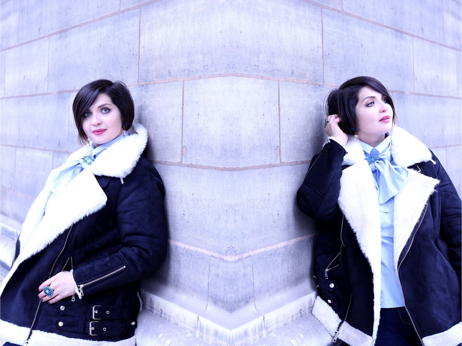 Pour l'effet rock, j'ai fait le choix de bottines noires avec un look très reptilien et un blouson aviateur en (fausse) peau de mouton retournée. C'est la pièce ultra chaude et cosy dans laquelle j'adore me blottir.